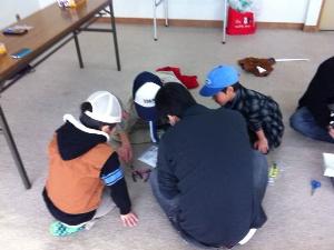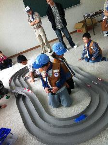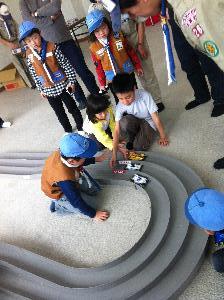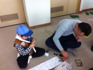 お父さんに手伝ってもらって 早く走るマシンを作ります。 |