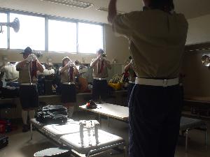 | 曲順や隊形の指示を受けます。 しっかり聞いていないと 大変なことになってしまいます。 パレード中のミスは 個人のものであっても 隊の名誉に傷がつくので 気合が必要です。 |