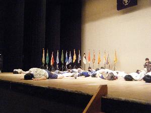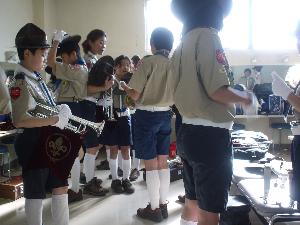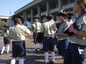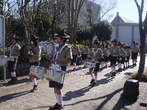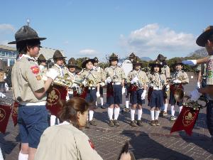 | 全世界で(多分)BP祭が 開催されて、 スカウト運動に参加する喜びを 感じます。 (開会で演奏するトランペット鼓隊) |