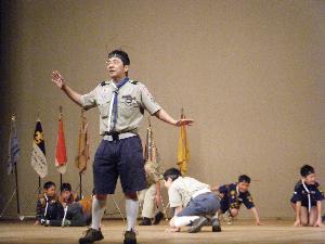 | 閉会式では、 連盟歌を皆で合唱しました。 全体の指揮をするボーイ隊副長 |