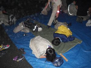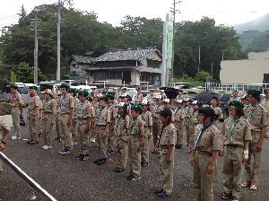 | 全体の閉会式。 どのスカウトもこの疲れた状況で しっかり整列しています。 「最近の子は根性が無い」 なんて、絶対に言わせません。 35キロです。 12時間。 しかも徹夜・雨・山道 |