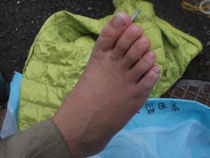 35キロ、12時間以上歩いた 足です。 ぼろぼろ。マメの数多数。 でも、この足で歩いたのです。 |