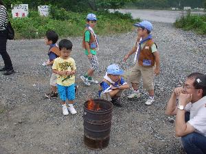 | さらに調理に使うために 火を大きくします。 ウチワ部隊活躍中。 |