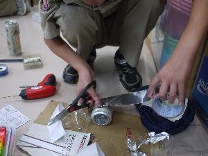 アルミ缶を加工します。 なかなか上手く行きません。 きったり貼ったりはめ込んだり。 |
