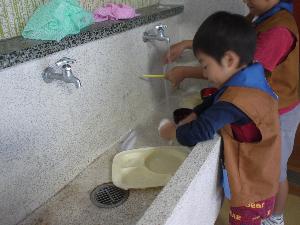 | そして食器を自分で洗います。 ちゃんと洗剤をつけて ふきんで拭いて格納します。 しっかりやらないと次回 カビだらけに・・・ 様々な経験をした集会でした。 |