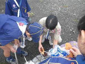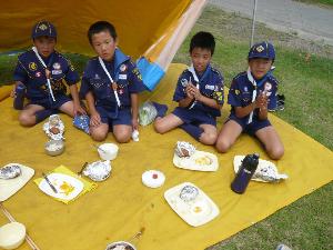そして起床!! 5時頃に起きたスカウトもいましたが 隊長の「起床」の合図までは、 静かにしていなくてはいけません。 |