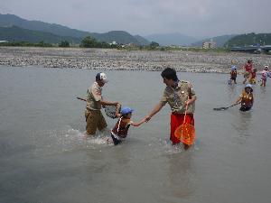 | 団委員長も無理やり参加。 胸まで使って大はしゃぎです。 本人曰く 「川は良いね」 |
