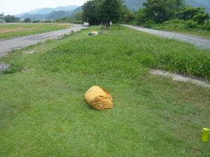 デンリーダーの力も借ります。 一見芝生の上で好条件すが 実は河原で、草の下は石。 結構難しい状況です。 |