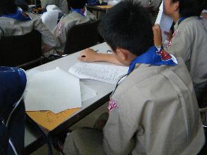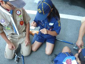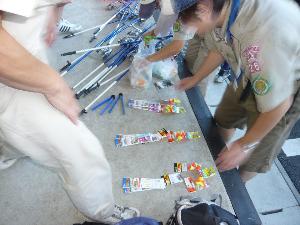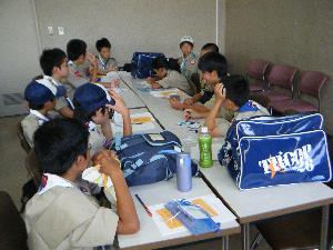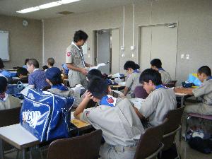 ![]() | カブ隊の隊集会です。 隊長から今度の釣り集会で 使うものが組長に渡されています。 |