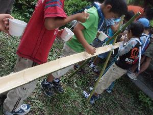 | 最後は流しソーメン。 団委員長とお父さん達の、傑作です。 料理は団委員会の皆様。 大歓声が上がりました。 |