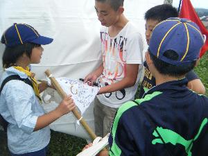 | 交流の様子です。東部地区の団からご招待を受け、交流会に参加させてもらいました。 ほかに、アメリカのスカウト隊からも声が掛かりました。感激です。 右は、見学に来ていたカブスカウトからサインをお願いされている図です。 |