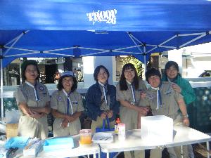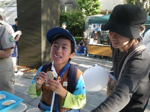 フェアには各団がブースを出します。 26団は、アウトドアデザート チーズケーキ風味のお菓子を アウトドアで作る体験コーナーです。 ご奉仕いただいた団委員さんと 指導者の皆様 |