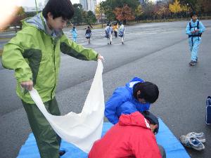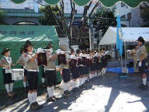 救急法などがあります。 ほかに、計測、通信、ロープ ちかいとおきて 等のコーナーがあり、 日ごろの成果を競い合います。 |