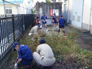 | 米が蒸しあがるまで カブスカウトは 普段お世話になっている 青少年会館の清掃奉仕 雑草を取り除き すっきりしました。 |