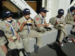 | 二日目の朝食は合同で。 他の団の先輩スカウトから 指導を受けたそうです。 |