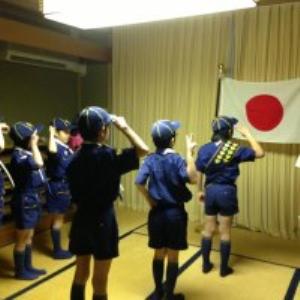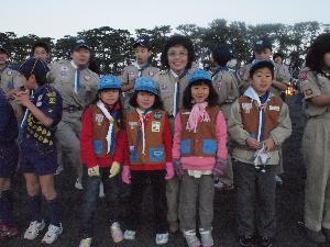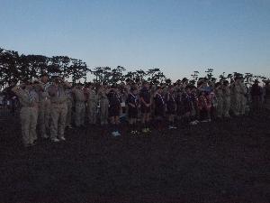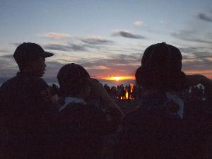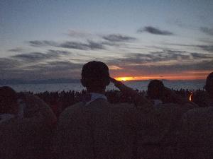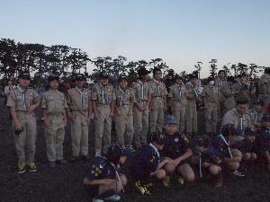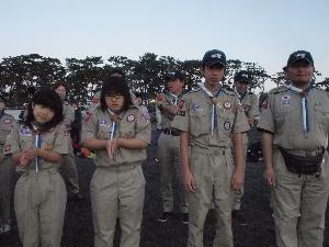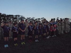 | カブ隊指導者 日の出を遥拝するときは 半そで、敬礼です。 例年、半そでになる指示が早いと スカウトたちからクレームが・・・ 今年は、ばっちりのタイミングでした。 |