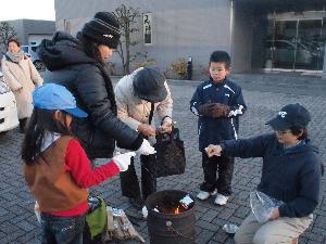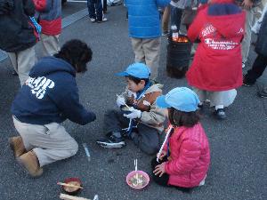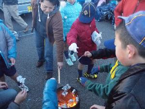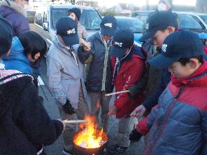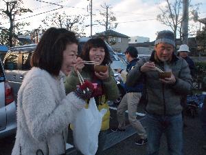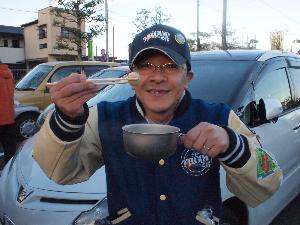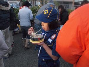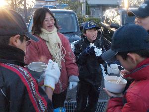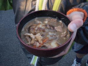 寒い後は、温かい豚汁で。 団委員会特性です。 この中に焼いた御餅を入れます。 最高です。 |