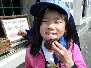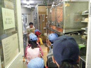 午後はスペシャル。 なんと、園付属動物病院の 見学です。 獣医師の先生に説明をして いただきました。 先生に手にあるのは 麻酔銃の矢! |