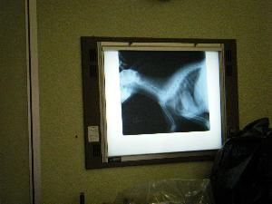 | 動物園の病院には 保護された動物も 運び込まれるのだそうです。 そんな、カモシカの レントゲン。 残念ながら、 頚骨骨折だったそうです。 |