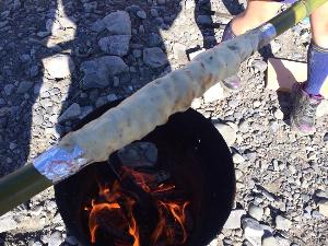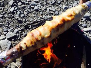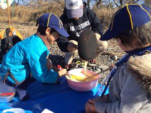 カブ隊は野外調理 先ず生地を作ります。 粘り具合が肝心です。 |