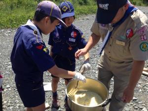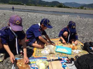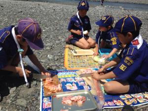 キャンプの事前訓練も兼ねてです。 組で分担して、材料の準備をします。 |