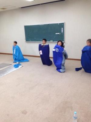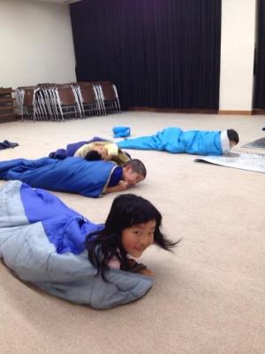 | 芋虫軍団の登場だ 寝袋に興奮気味 |