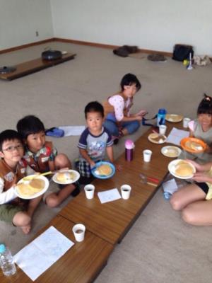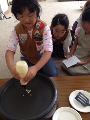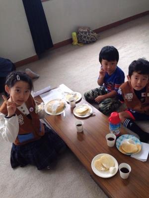 | ホットケーキを作りました。 最近、パンケーキとかいって 流行ってるらしいですが 26団ではキャンプの朝食で昔から 食事として食べていました。 |