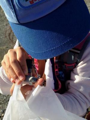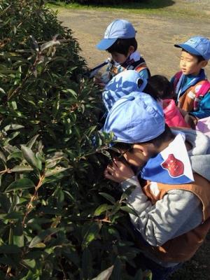 | 秋のキャンプでお世話になった 自然観察指導員の方が 今日もご指導に来て下さいました。 ルーペでのぞく世界に興味しんしんです。 |